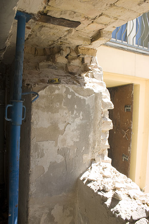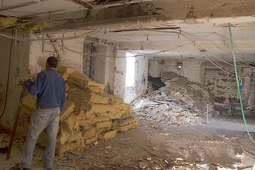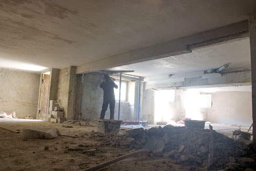Die Auflagefläche für die neuen, längeren Stahlträger entsteht - die Geschossdecke haengt frei.