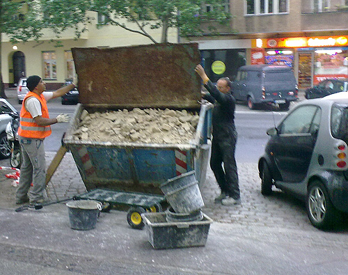 Gestern haben die Bauleute an einem Tag einen 7Kubik-Container mit Bauschutt gefüllt, der erste von zahlreichen Schuttcontainern die noch folgen werden. Obwohl der erste Berg von Metallteilen schon entsorgt wurde, hat sich bereits ein neuer Berg von Metallprofilen und Teilen der alten Lüftungsanlage auf eine Höhe von knapp zwei Metern angehäuft. Ausserdem liegen noch haufenweise Rigipsplatten, Glaswolle und Schutt herum ohne dass die Abrissarbeiten zu Ende gehen. Da relativiert sich meine Unordnung zu Hause wirklich sehr.